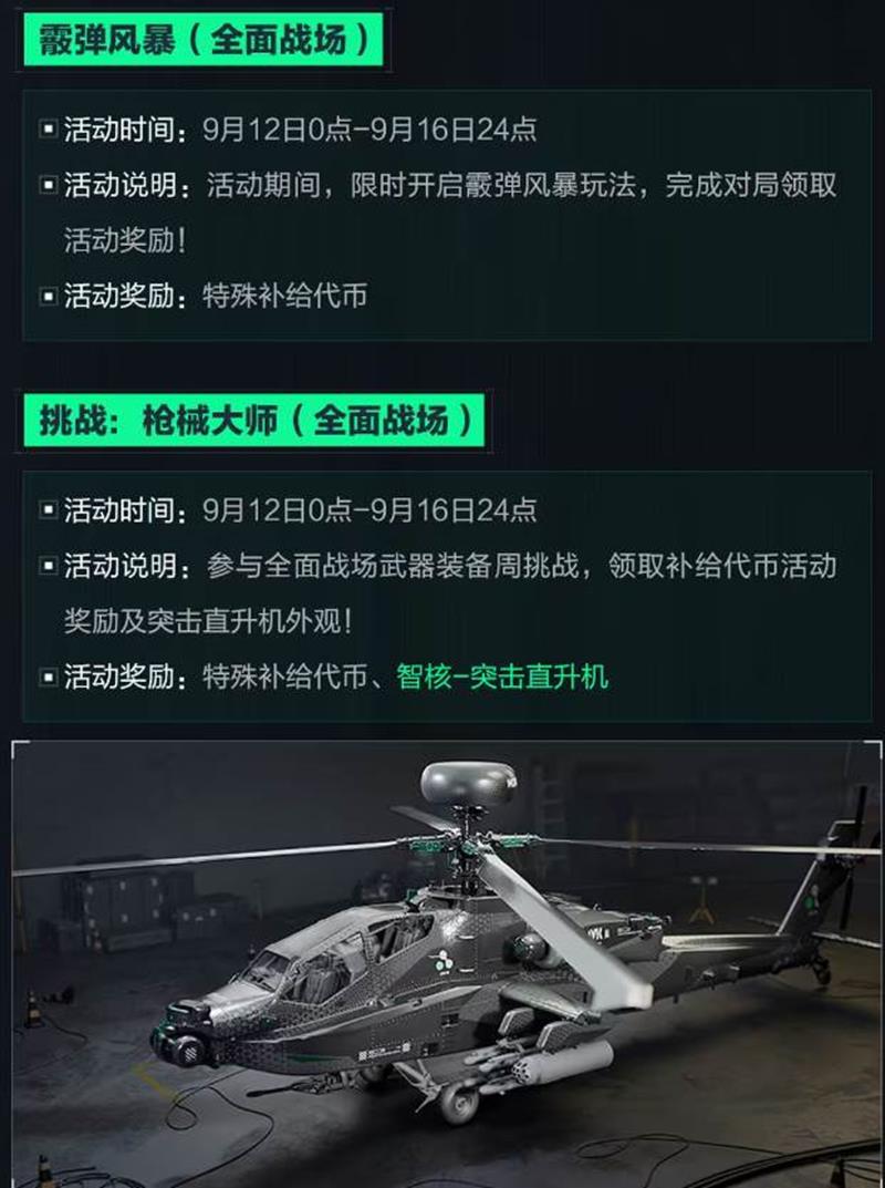 参与全面战场武器装备周挑战,领取补给代币活动奖励及突击直升机外观。
