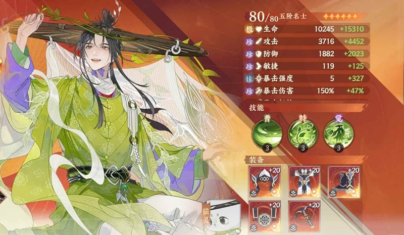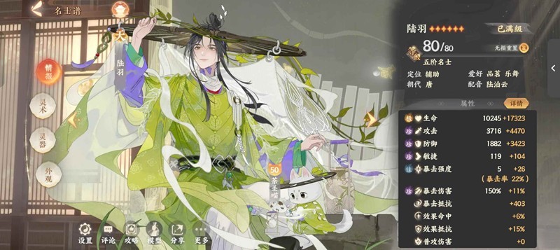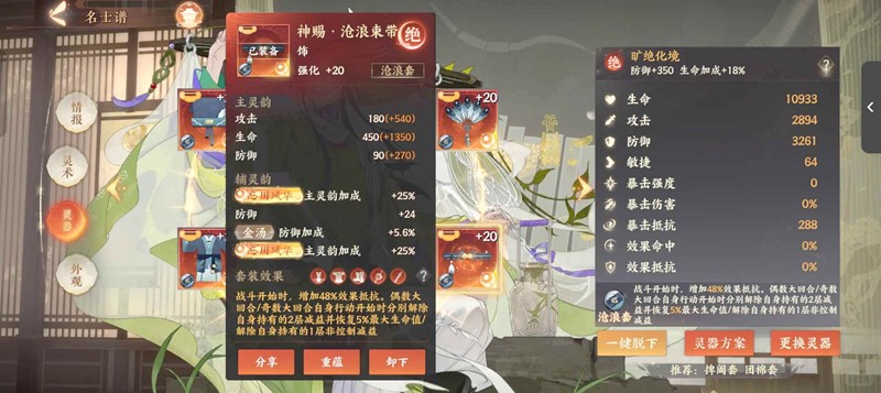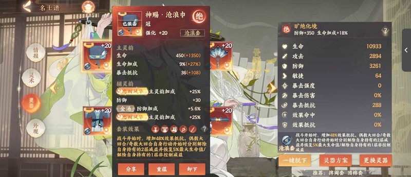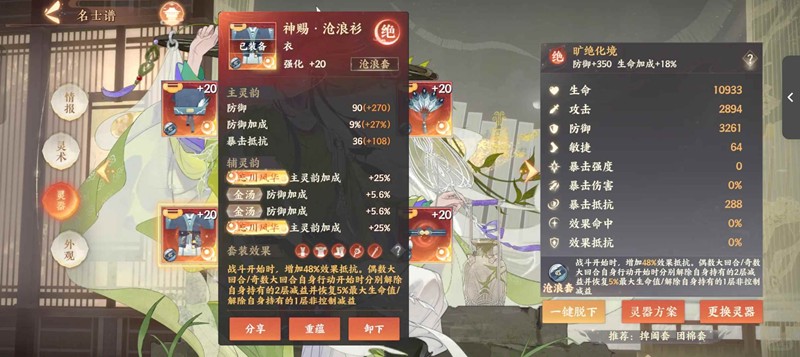 沧浪套的陆羽以存活为主,由于流泉可以减少携带者的爆抗,减少数值为陆羽爆抗的30%,所以衣帽选择爆抗主灵韵,鞋子生命,武器配饰防御(防御武器以洗敏捷词条为主,图内为临时带的武器,不推荐风华)