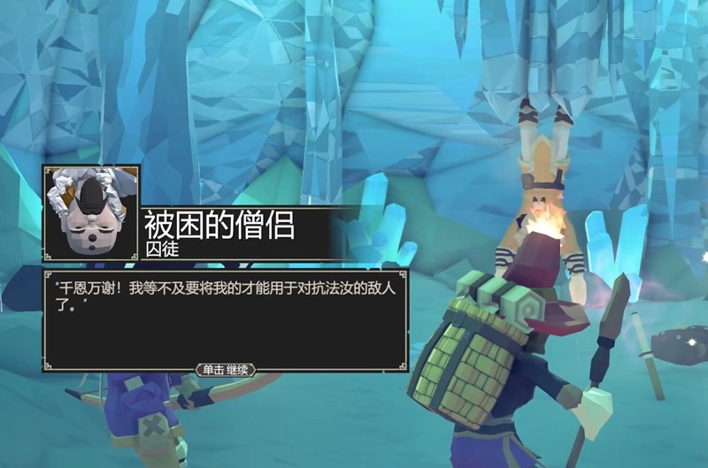 在洞穴中击败所有敌人后,玩家会遇到被倒吊的僧侣。此时,僧侣会与玩家交谈并请求救援。是否选择拯救他取决于玩家的决定,但若想解锁僧侣角色,必须选择拯救。一旦成功救出,僧侣将承诺为玩家效力,并成为可用角色。这个过程只需要完成一次,之后即可永久使用僧侣角色。