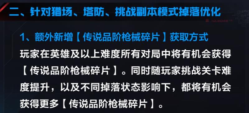 1.额外新增【传说品阶枪械碎片】获取方式:玩家在英雄及以上难度所有对局中将有机会获得【传说品阶枪械碎片】。同时随玩家挑战关卡难度提升,以及不同掉落状态影响下,都将有机会获得更多【传说品阶枪械碎片】。