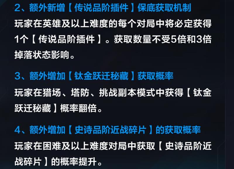 2.额外新增【传说品阶插件】保底获取机制:玩家在英雄及以上难度的每个对局中将必定获得1个【传说品阶插件】。获取数量不受5倍和3倍掉落状态影响。