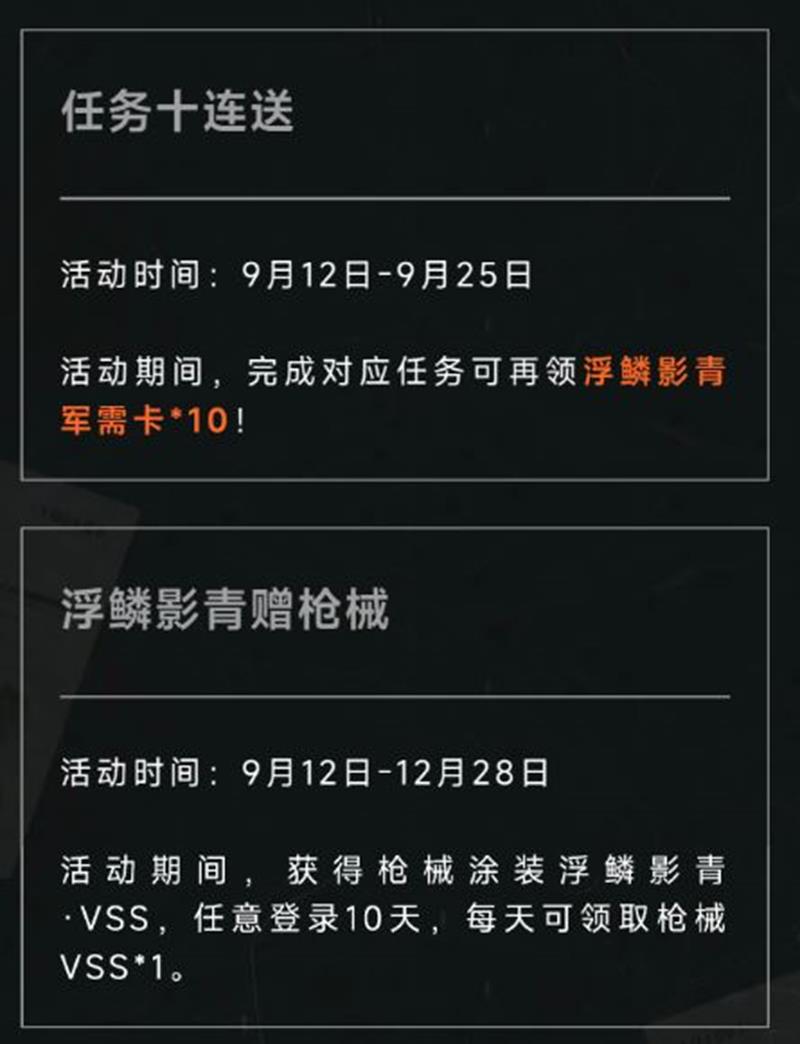 活动期间,获得枪械涂装浮鳞影青·VSS,任意登录10天,每天可领取枪械VSS*1。