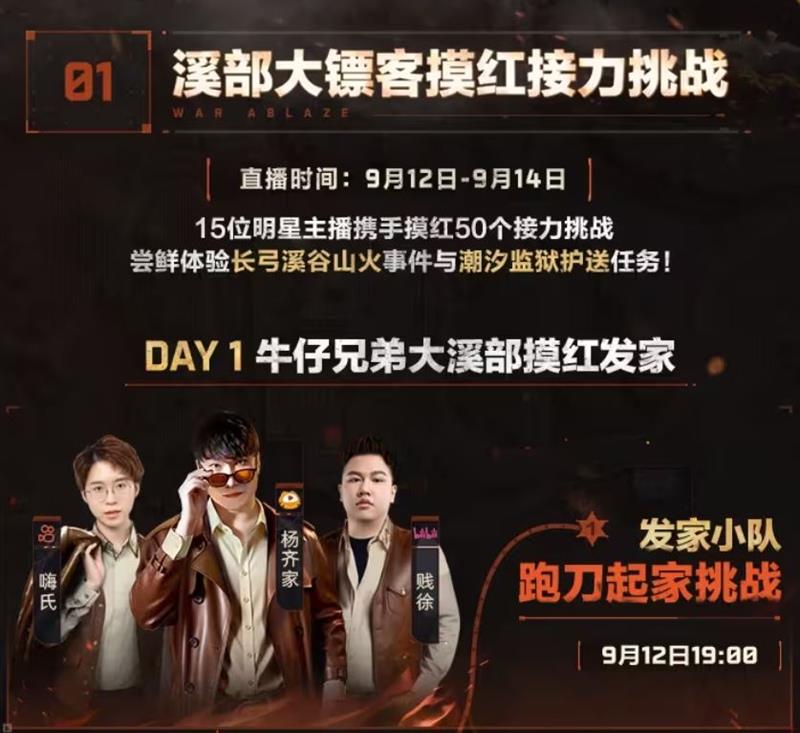 DAY 1(9月12日):牛气兄弟大溪部摸红发家发家小队将在19:00开启跑刀起家挑战,参与的主播包括 贱徐、 杨齐家、 南波等。