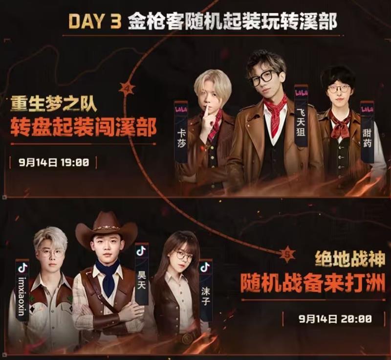 DAY 3(9月14日):战场高手大团建谁才是猎空之王19:00重生梦之队转盘起装闯溪部,26:00绝地战神随机战备来打洲,主播包括 imxiaoxin、 昊天、 沫子等。