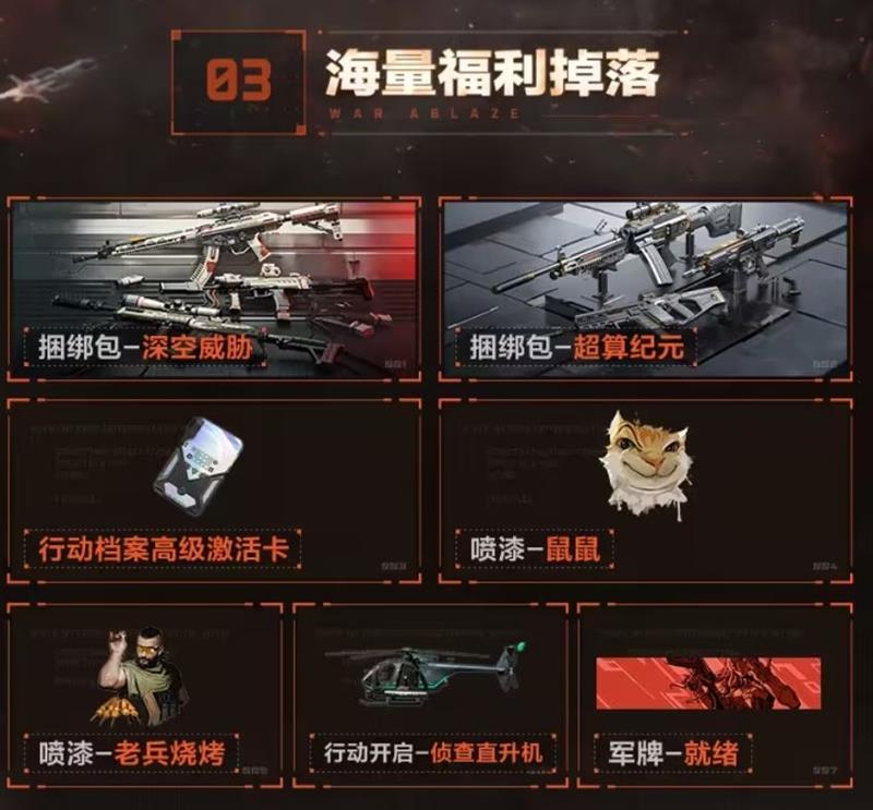 除了精彩的直播内容,本次《三角洲行动》新赛季直播活动还准备了海量福利。包括捆绑包-深空威胁、捆绑包-超算纪元、行动档案高级激活卡、喷漆-鼠鼠、喷漆-老兵烧烤、行动开启-侦查直升机、军牌-就绪等,为玩家提供丰富的游戏内奖励。