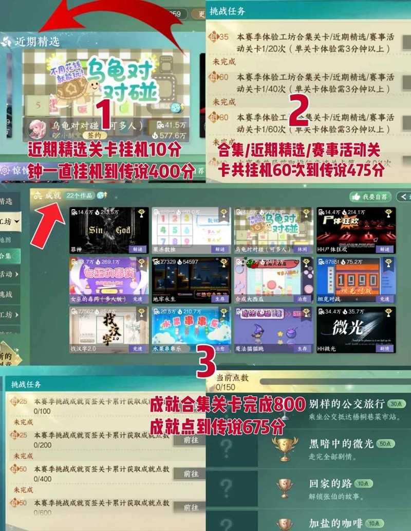 二:找任意合集/精选/赛事活动关卡挂机3分钟后,重复60次,可达到475分(可以跟第一个步骤一起挂一共完成60次就行)