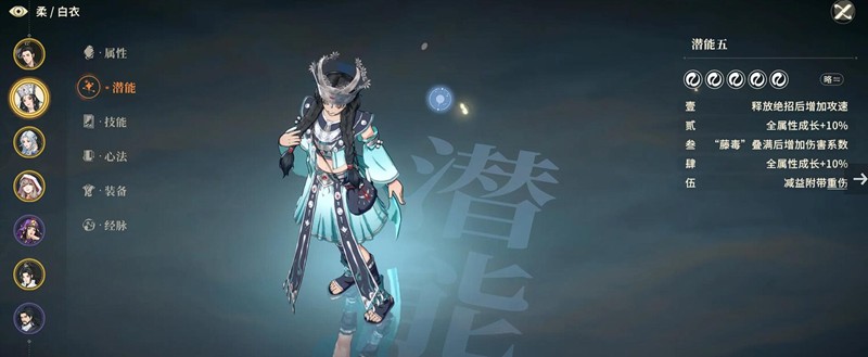 心法必带百毒心经,毒伤独立增伤25%,获取方式为沙匪营地隐藏BOSS顺奕掉落(井里触发战斗)。没刷到百毒心经的话,建议暂时不要培养,否则输出会不足。经脉优先点藤毒层数(开局自带3层毒)和毒伤加剧(每层毒伤+5%),50级后点毒雾扩散(大招多扩散2层毒)。总体来说,对决!剑之川白衣适合新手过渡使用,后期搭配阿曼沙能进入毒伤队,资源有限的情况下选择白衣不会亏。