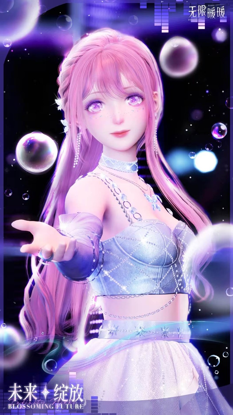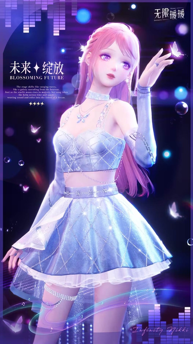 主属性为甜美的「未来绽放」套装,以梦幻的星光为主题,融合了海浪与银河的元素,仿佛将整个宇宙的浪漫都融入其中。她的歌声如同掌舵的船长,穿越时空,将斑斓的色彩编织成幻梦的经纬。