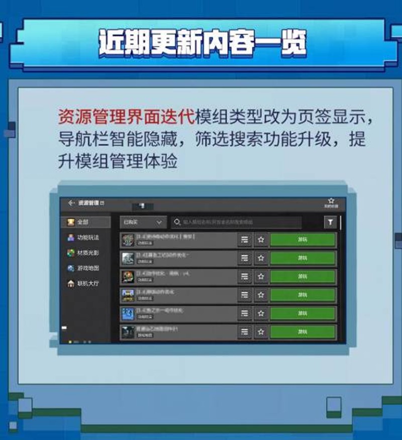 除了即将上线的全新基岩互通版,官方还对游戏进行了一系列的更新和优化,包括资源管理界面的迭代模组类型改为页签显示,导航栏智能隐藏,筛选搜索功能升级,提升模组管理体验。
