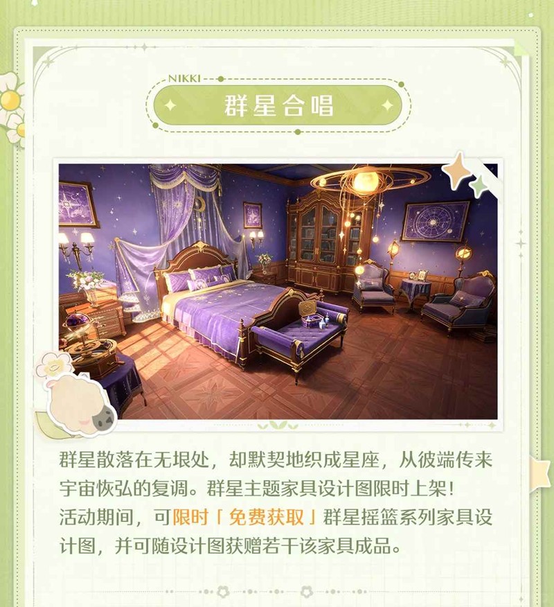 活动期间,可限时「免费获取」群星摇篮系列家具设计图,并可随设计图获赠若干该家具成品。
