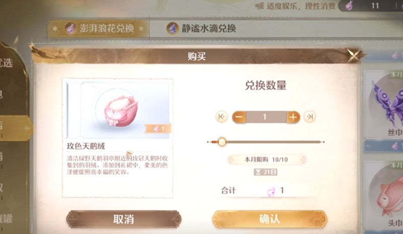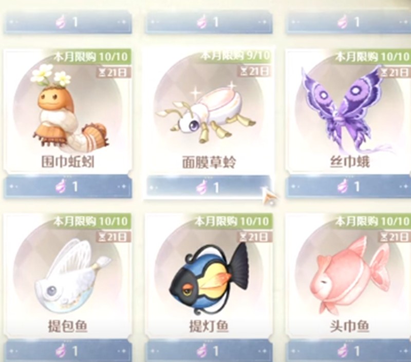 我们可以使用澎湃浪花兑换多种特色物品,包括围巾蚯蚓、绸带鱼、面膜草蛉、头巾鱼等。这些物品都能为玩家的游戏进程提供帮助。需要注意的是,商店中的所有物品都存在月度限购机制,每个物品每月最多只能兑换10次,超过限制后将无法继续兑换。