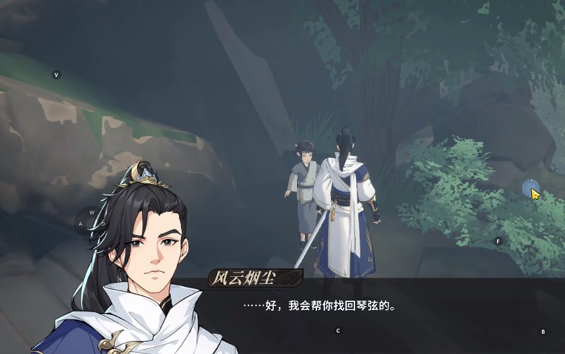 进入楚家庄后,玩家首先需要与黑衣人战斗,并在左侧找到一位黑衣人进行组队对抗。战斗结束后,玩家可以带领角色向山下移动,在台阶上遇到一名NPC小女孩,帮助她寻找琴弦。这一任务完成后,玩家需要返回山庄大门前开启宝箱,但此时宝箱并不会立即出现,必须使用策略卡“光明圣火”和“浴火涅槃”点燃两盏灯,才能触发宝箱的出现。