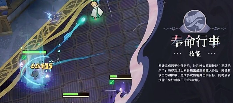 当沙利叶完成任务后,“王牌绝杀”技能会被激活。该技能让他迅速出现在敌方关键角色背后,对其造成大量伤害并削弱其攻击力和护甲。这一技能不仅提升了沙利叶的爆发能力,还能在击倒敌人后刷新其他技能的冷却时间,让他在战斗中更加灵活。