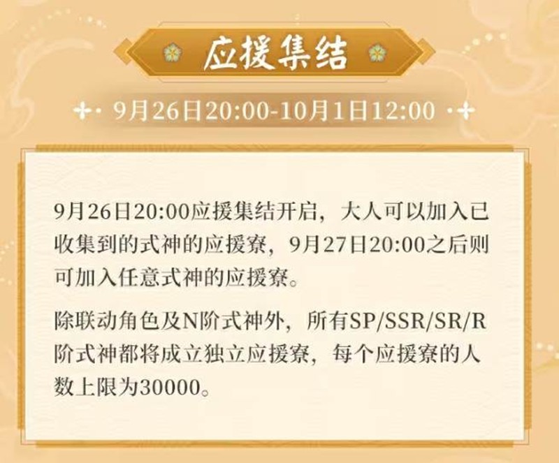 内容:应援集结开启,大人可以加入已收集到的式神的应援寮。9月27日20:00之后则可加入任意式神的应援寮。除联动角色及N阶式神外,所有SP/SSR/SR/R阶式神都将成立独立应援寮,每个应援寮的人数上限为30000。