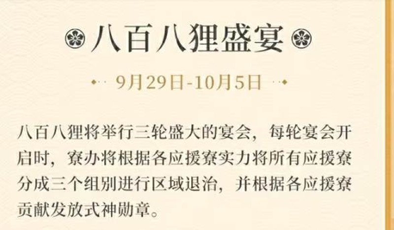 内容:八百八狸将举行三轮盛大的宴会,每轮宴会开启时,赛办将根据各应援寮实力将所有应援寮分成三个组别进行区域退治,并根据各应援寮贡献发放式神勋章。
