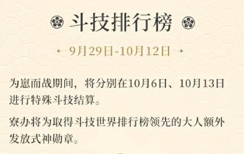 内容:为崽而战期间,将分别在10月6日、10月13日进行特殊斗技结算。赛办将为取得斗技世界排行榜领先的大人额外发放式神勋章。