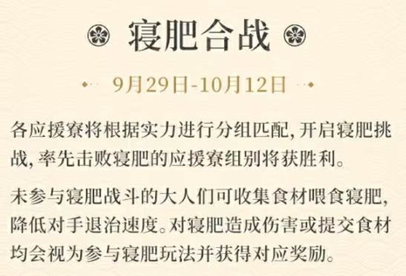 内容:各应援寮将根据实力进行分组匹配,开启寝肥挑战,率先击败寝肥的应援寮组别将获胜。未参与寝肥战斗的大人们可以收集食材喂食寝肥,降低对手退治速度。对寝肥造成伤害或提交食材均会视为参与寝肥玩法并获得对应奖励。