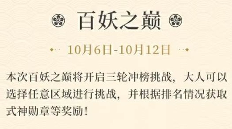 内容:本次百妖之巅将开启三轮冲榜挑战,大人可以选择任意区域进行挑战,并根据排名情况获取式神勋章等奖励!