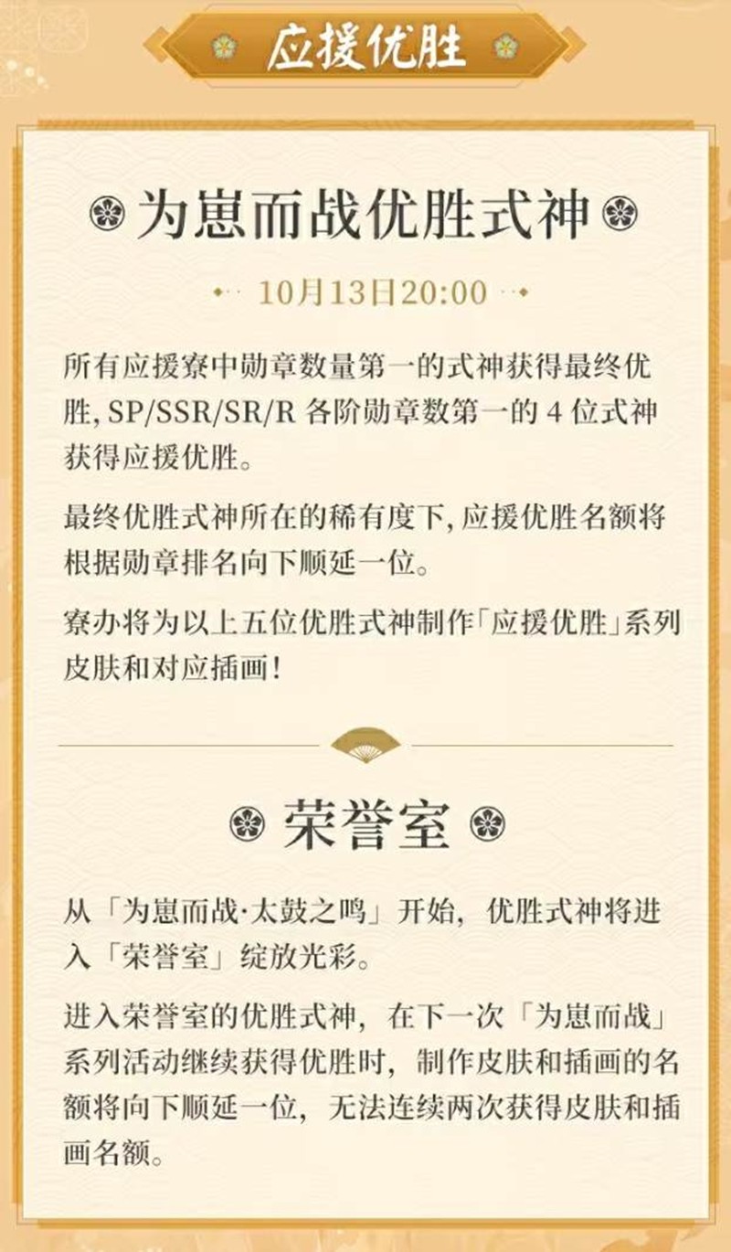 内容:从「为崽而战·太鼓之鸣」开始,优胜式神将进入「荣誉室」绽放光彩。进入荣誉室的优胜式神,在下一次「为崽而战」系列活动继续获得优胜时,制作皮肤和插画的名额将向下顺延一位,无法连续两次获得皮肤和插画名额。