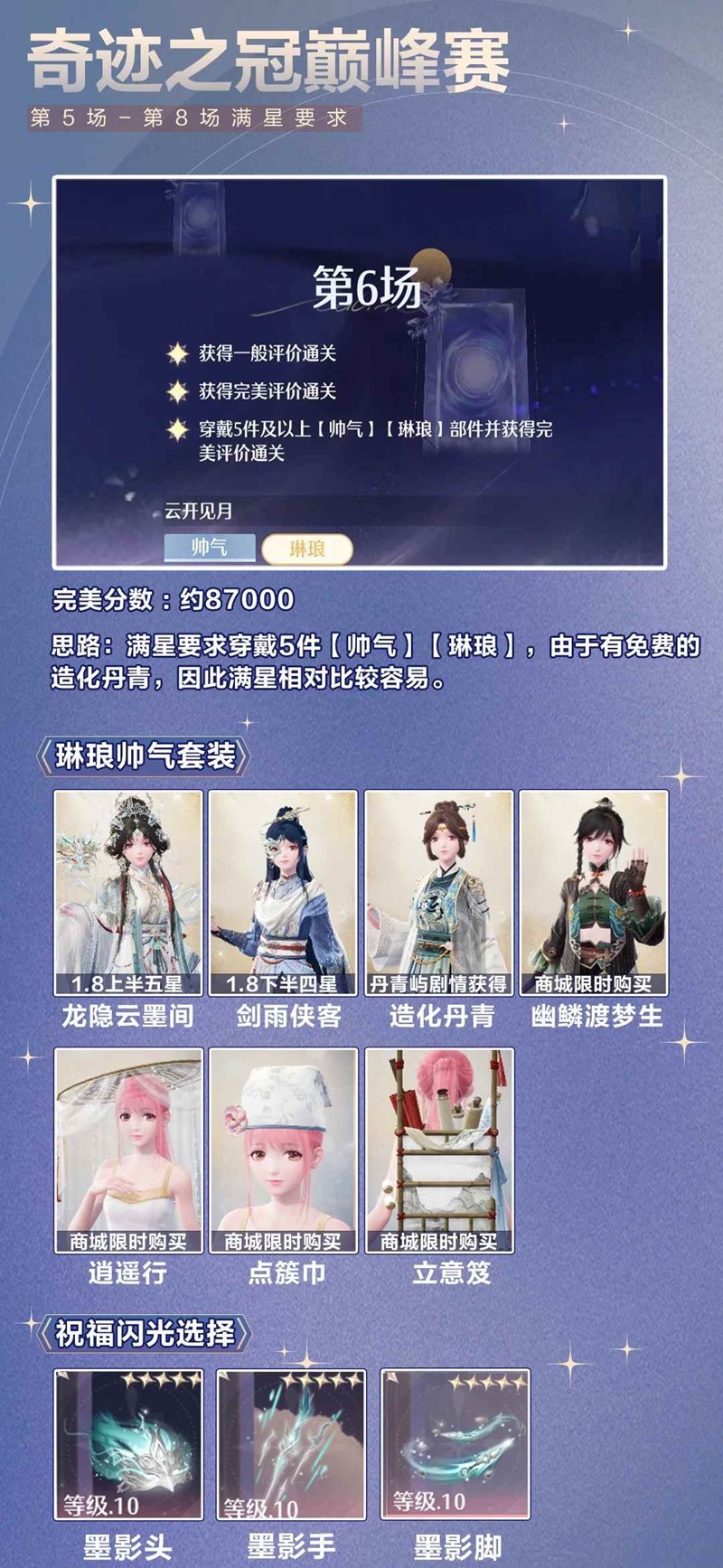 > 第6场符合【帅气】【琳琅】标签部件的套装有【造化丹青】【龙隐云墨间】【幽鳞渡梦生】,还有商城单品【点簇巾】【逍遥行】【立意笈】,可以拿以上任意部件凑标签。