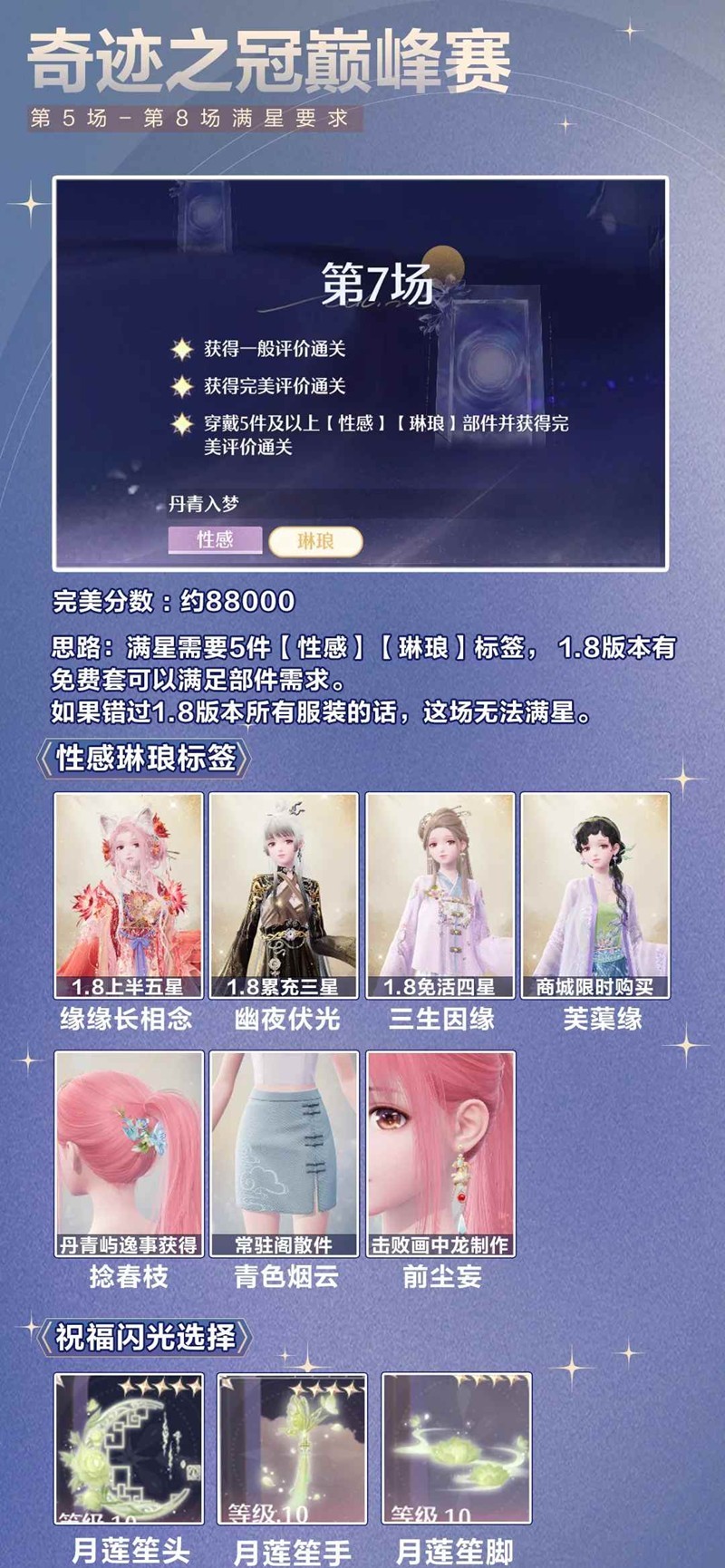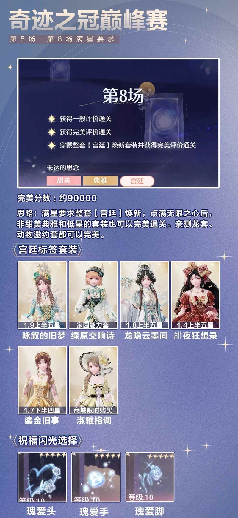 > 第8场【宫廷】标签套装如下图所示,典雅或甜美属性的套装得分会高一点,亲测动物邀约、龙套焕新后也能过关(无限之心需点满)
