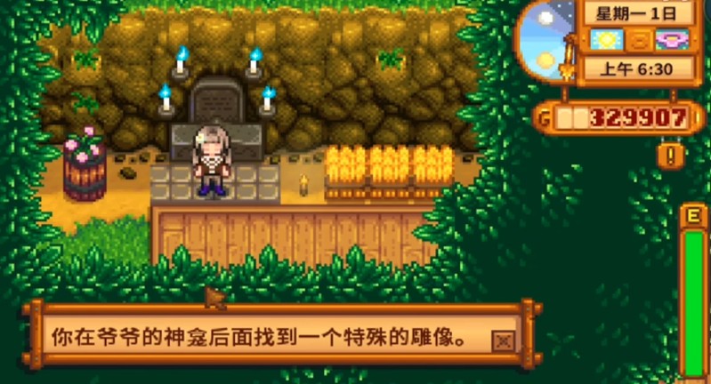 评分系统支持重置功能,如果玩家在第三年中途发现某些项目未能达标,可以通过向佛龛供奉一颗钻石来重置全部评分进度。这意味着玩家有一次机会重新规划发展方向,以争取在年末前点亮全部四根蜡烛。虽然即使评分不佳也不会导致游戏失败或强制重来,但四根蜡烛全亮后可在年末获得特殊奖励——每天可从佛龛旁的雕像领取一块铱金矿。这一资源在星露谷物语后期极为珍贵,可用于升级农场建筑或制作高级工具。