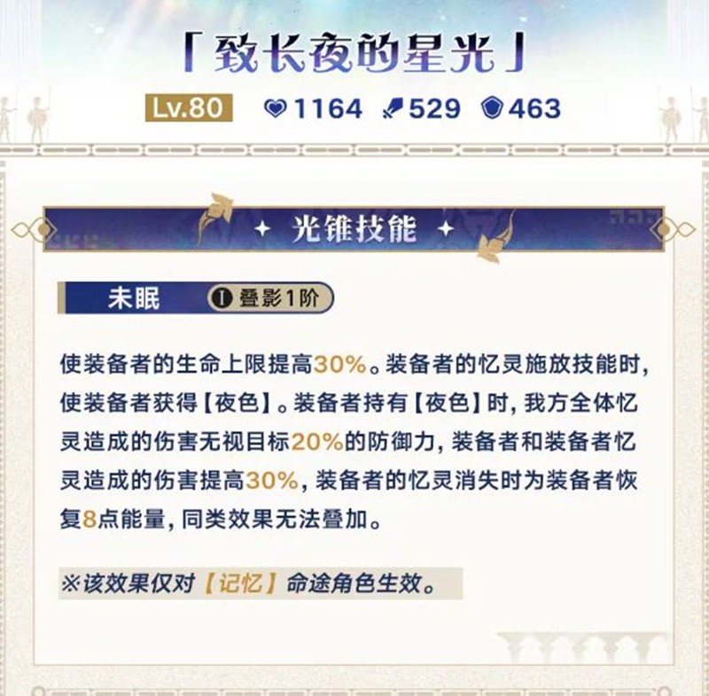 使装备者的生命上限提高30%。装备者的忆灵施放技能时,使装备者获得【夜色】。装备者持有【夜色】时,我方全体忆灵造成的伤害无视目标20%的防御力,装备者和装备者忆灵造成的伤害提高30%,装备者的忆灵消失时为装备者恢复8点能量,同类效果无法叠加。※该效果仅对【记忆】命途角色生效。