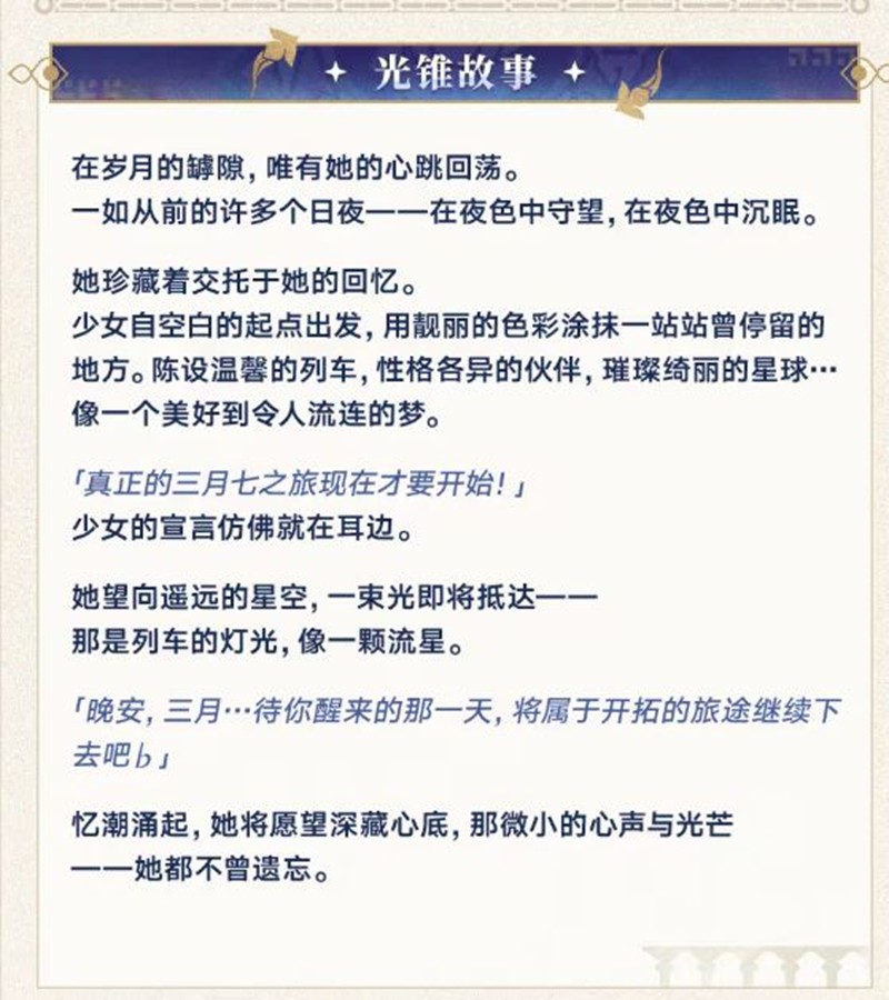 真正的三月七之旅现在才要开始!少女的宣言仿佛就在耳边。她望向遥远的星空,一束光即将抵达——那是列车的灯光,像一颗流星。「晚安,三月…待你醒来的那一天,将属于开拓的旅途继续下去吧♪」