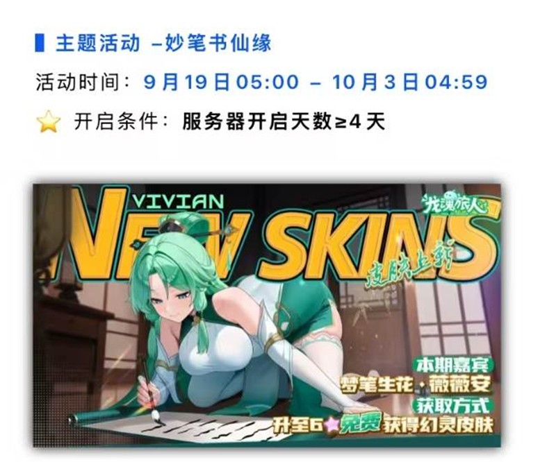 全新限定召唤卡池“湖中仙女·薇薇安”将于9月19日05:00至10月3日04:59期间开启。服务器开启天数需达到4天方可参与。