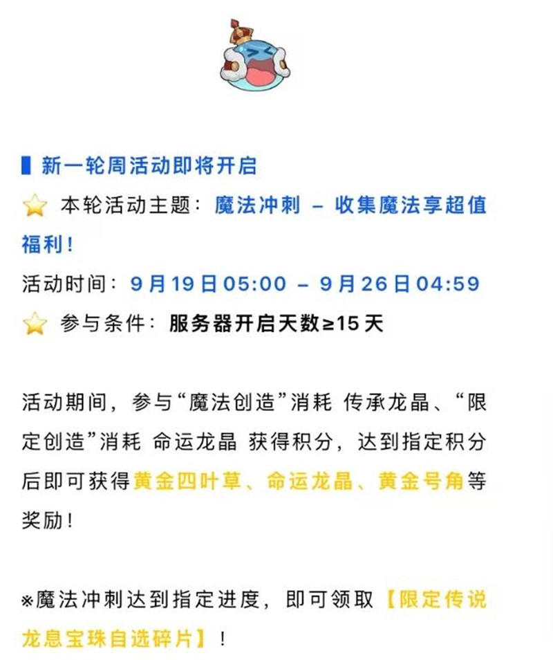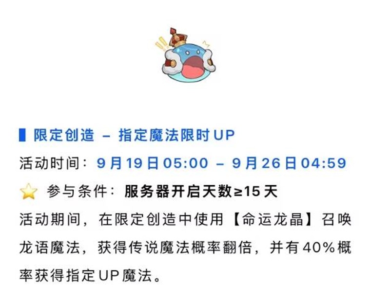 活动期间,在限定创造中使用【命运龙晶】召唤龙语魔法,获得传说魔法概率翻倍,并有40%概率获得指定UP魔法。