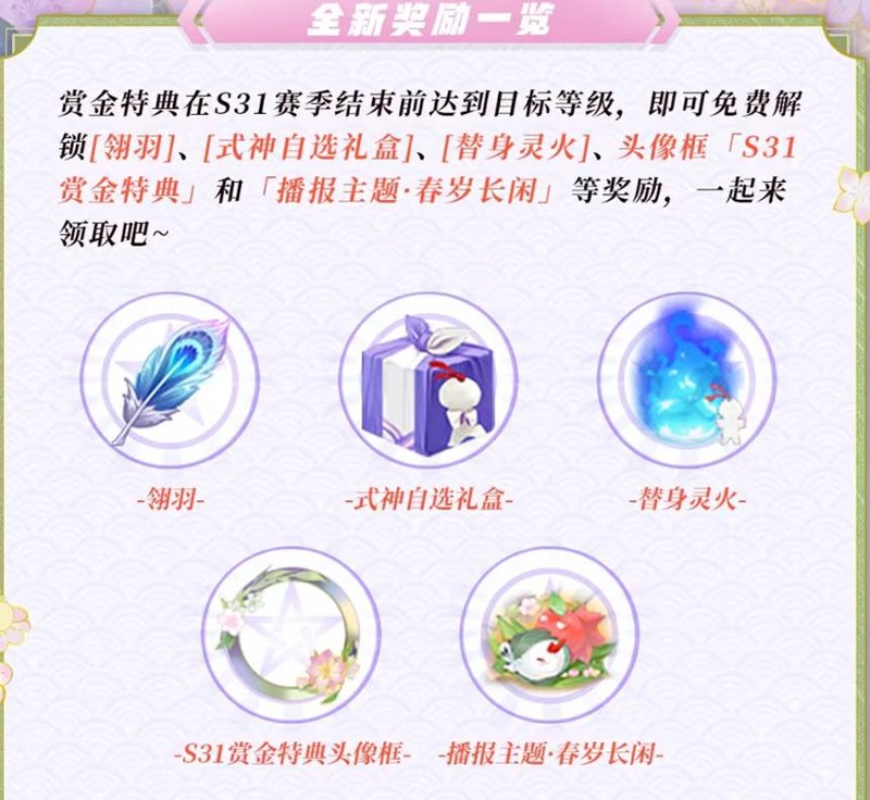 在S31赛季结束前达到目标等级,玩家即可免费解锁包括[翎羽]、[式神自选礼盒]、[替身灵火]、头像框「S31赏金特典」和「播报主题-春岁长闲」等奖励。