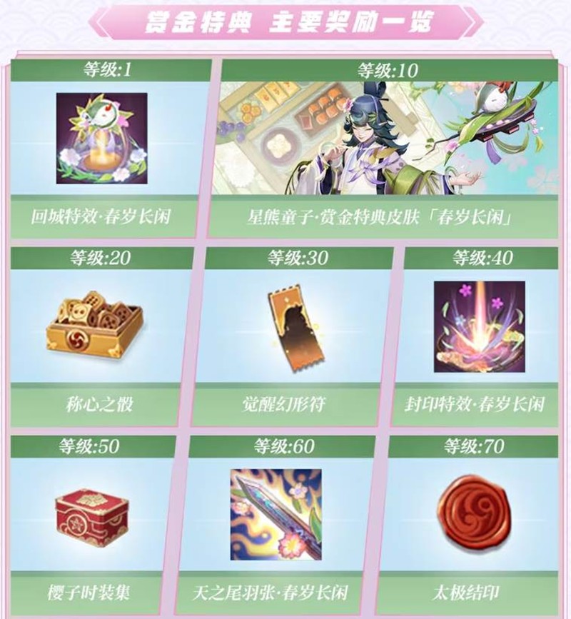 380勾玉或660勾玉解锁赏金特典,解锁后即可领取对应等级的赏金特典奖励。购买“赏金特典直升包”,即可获得S31赏金特典限定头像框「S31赏金特典·珍」和可连升19级的赏金特典经验。