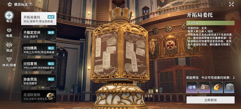 星痕共鸣每日委托任务可在主城开拓局传送点处接取,每天系统会刷新一轮包含三项任务的委托内容。玩家只需前往开拓局中央的建筑物进行交互,即可领取当天的任务。这些任务类型多样,包括进入指定副本击败敌人、在地图中采集特定物品、完成小游戏挑战以及运送货物等。每项任务难度适中,适合单人或组队进行,是星痕共鸣中稳定获取经验与荣誉币的重要途径。