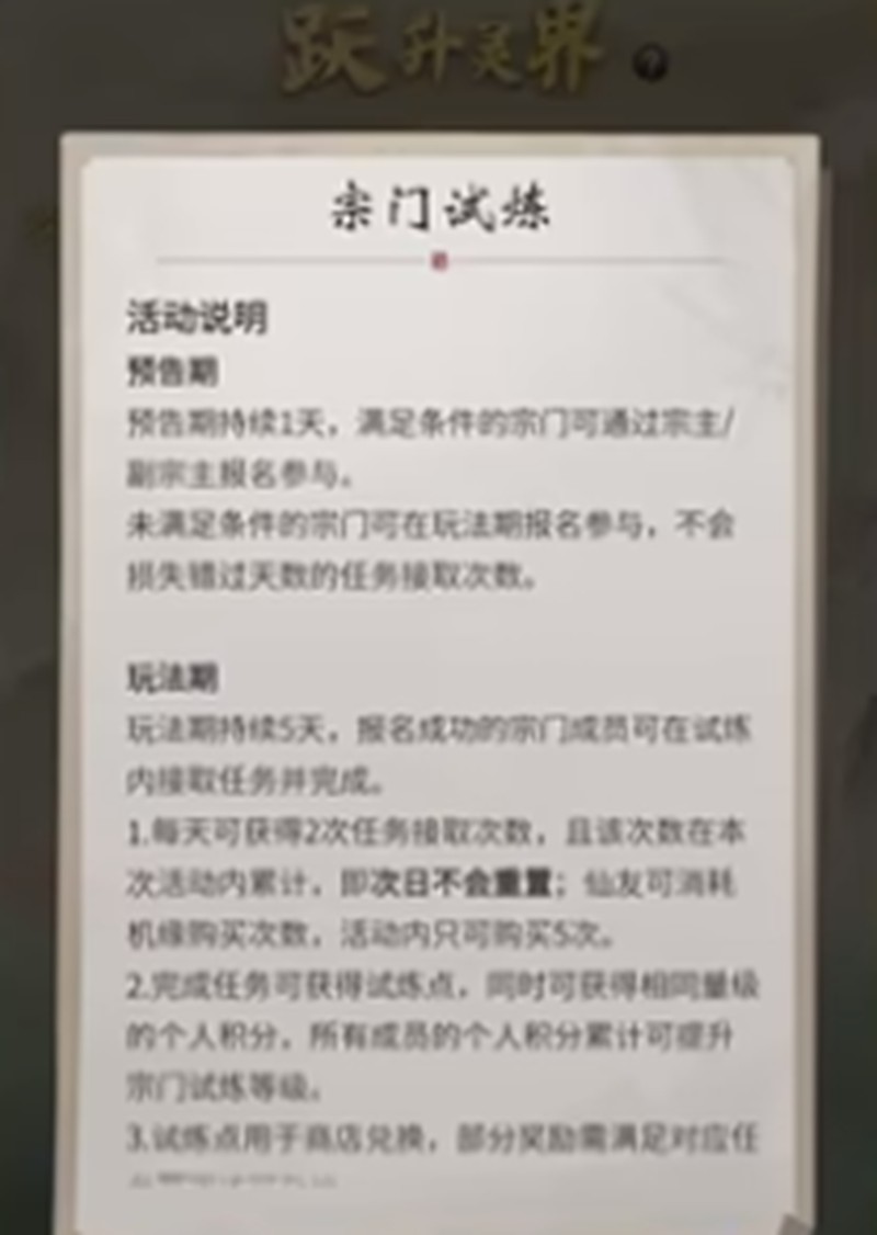 试炼点是宗门试炼中的核心货币,可通过完成任务稳定获取。玩家可在宗门试炼商店中使用试炼点兑换各类珍贵物品,包括突破丹药、灵石、功法材料以及限定古宝等稀有资源。部分高价值奖励设有兑换门槛,例如需完成特定品质的任务或宗门试炼等级达到指定阶段。因此,积极参与任务、提升宗门整体试炼等级,是解锁更多奖励的关键。
