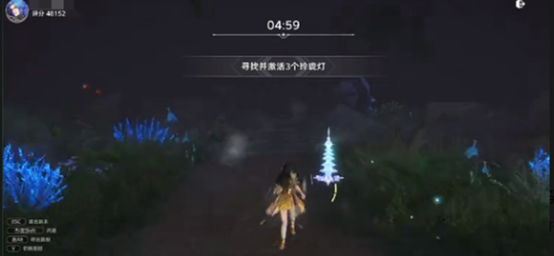 本次试炼的核心任务是在5分钟内找到并激活三盏玲珑灯。时间一启动,玩家需立即操控角色进入试炼区域展开探索。场景中小道蜿蜒,周围有蓝紫色夜光植物点缀,在微光映照下营造出神秘氛围,同时也为寻找目标提供一定视觉引导。第一盏玲珑灯通常出现在绿色喷泉附近,位置较为显眼,便于快速定位。