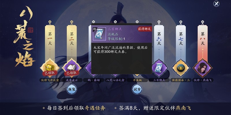 八日登录活动“八荒之焰”为新老玩家提供了短期高回报的绑点获取机会。连续登录六天即可领取300绑点,若在此期间完成7环奇缘任务,还能获得限定伙伴燕南飞。此类限时活动通常在版本更新或节日节点开启,建议密切关注游戏内公告,避免错过关键奖励。