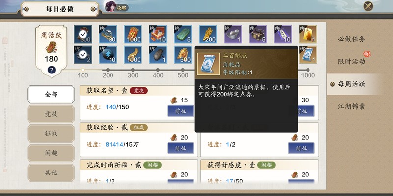 每周活跃任务系统整合了日常与周常内容,是中期玩家获取绑定点券的重要渠道。该系统分为竞技、征战、闲趣和其他四大类,完成对应任务可积累活跃点。每当活跃点达到100的倍数时,即可领取奖励,其中包括绑定点券与侠影招募帖。当活跃度升至满级1000点时,将额外获得200绑点和1个招募帖,建议每周尽量达成满活跃。