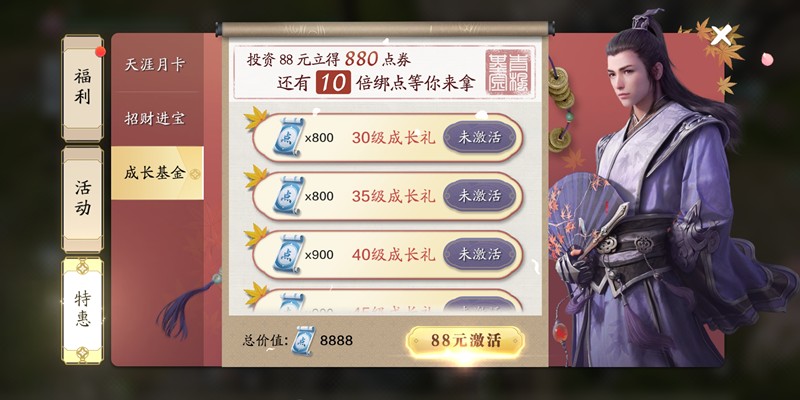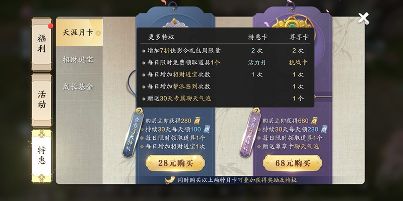 月卡是性价比极高的非绑点与绑点双重获取方式。天涯明月刀手游提供特惠卡与尊享卡两种选择。特惠卡售价28元,首购即赠280非绑点券,每日登录再领100绑点;尊享卡68元,首购送680非绑点券,每日登录可得230绑点。长期游玩的玩家建议入手尊享卡,收益更为可观。