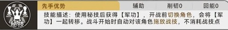 刻律德菈的秘技可在战斗前使用,使指定角色获得【军功】状态。若在开战前切换角色,【军功】状态会随之转移。进入战斗时,系统将自动对该角色释放一次战技,且不消耗战技点数。这一机制使得她在探索与快速清怪场景中具备较高的战术灵活性,尤其适合需要快速启动增益的场合。