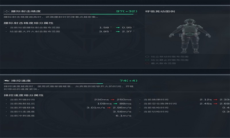 操控速度方面也有优化,综合评分提升至74点,其中跑步延迟从109ms缩短至88ms,大幅缩短了从移动状态切换到射击的响应时间。冲刺速度保持在6.1m/s,未因改装而牺牲机动性。配合40发扩容弹匣,保证了火力持续性的同时,也增强了转点、游走和接敌时的灵活性。虽然据枪稳定性仅为33点,后坐力控制评分53,在长连发时需要适当压枪,但通过短点射节奏可有效弥补。