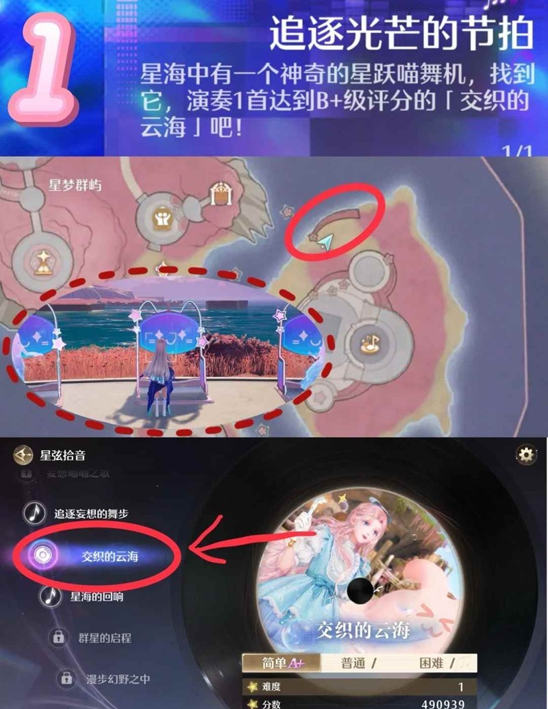 在星海新增区域找到喵舞机,完成B+评级“交织的云海”