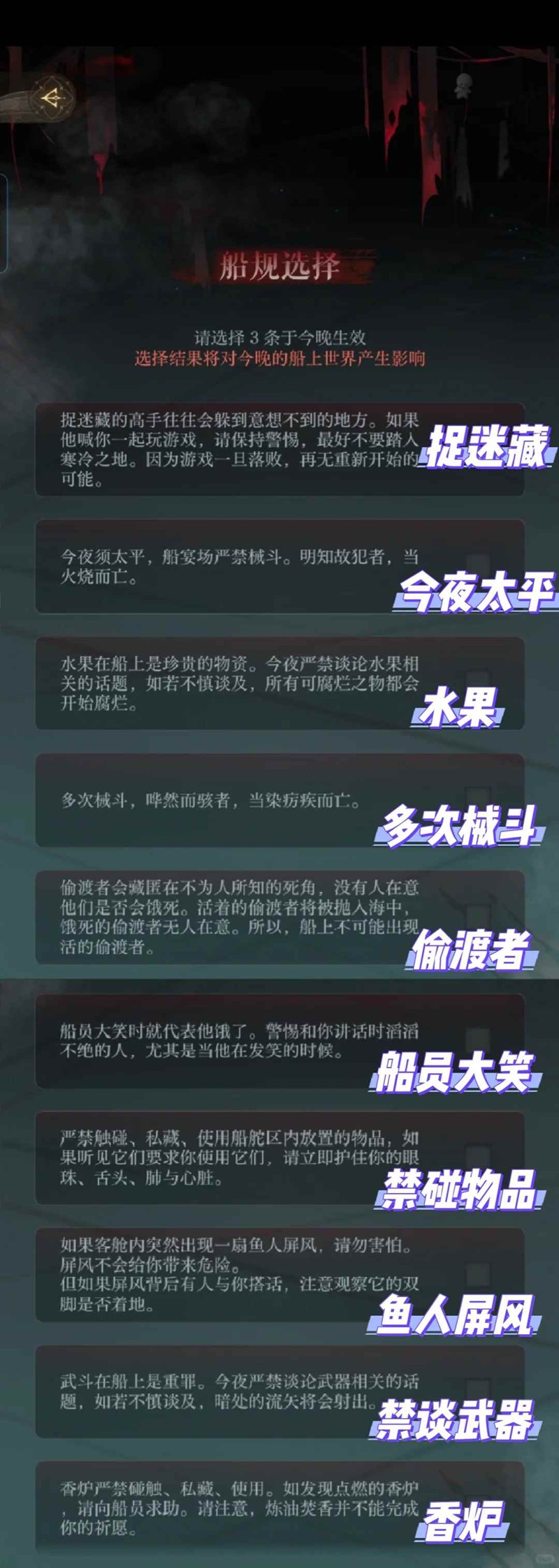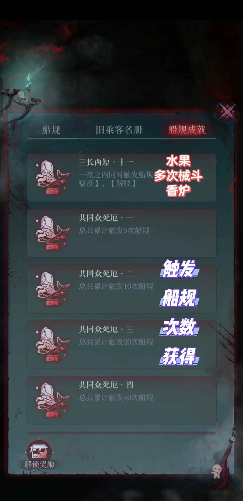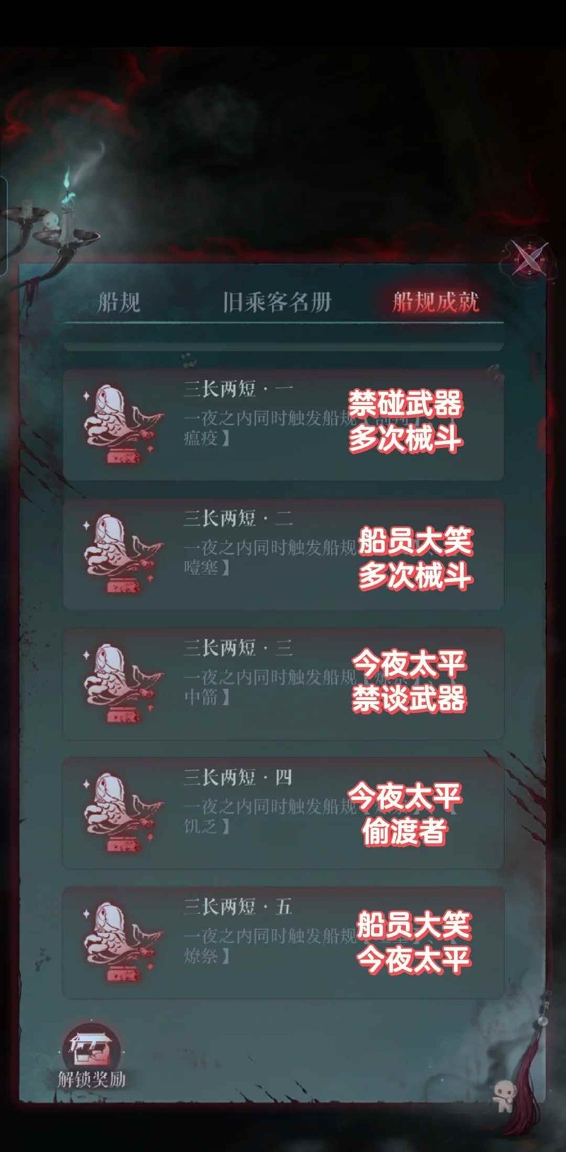 两个都有今夜太平这个条件,就可以选择三条船规,同时拿两个成就