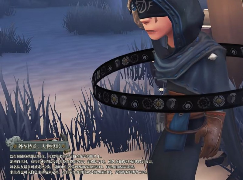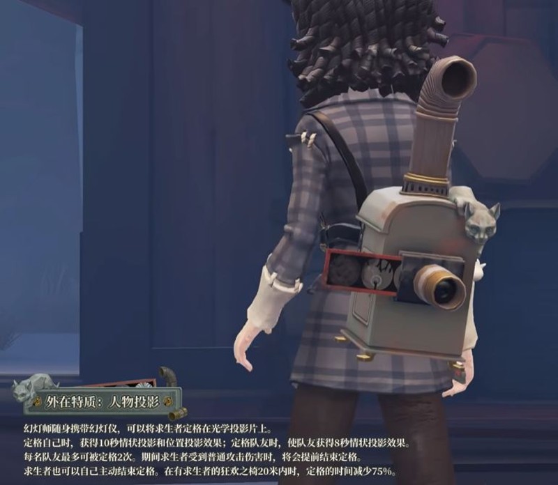 幻灯师随身携带幻灯仪,可以将求生者定格在光学投影片上。定格自己时,获得10秒情状投影和位置投影效果;定格队友时,使队友获得8秒情状投影效果。每名队友最多可被定格2次。期间求生者受到普通攻击伤害时,将会提前结束定格。求生者也可以自己主动结束定格。在有求生者的狂欢之椅20米内时,定格的时间减少75%。