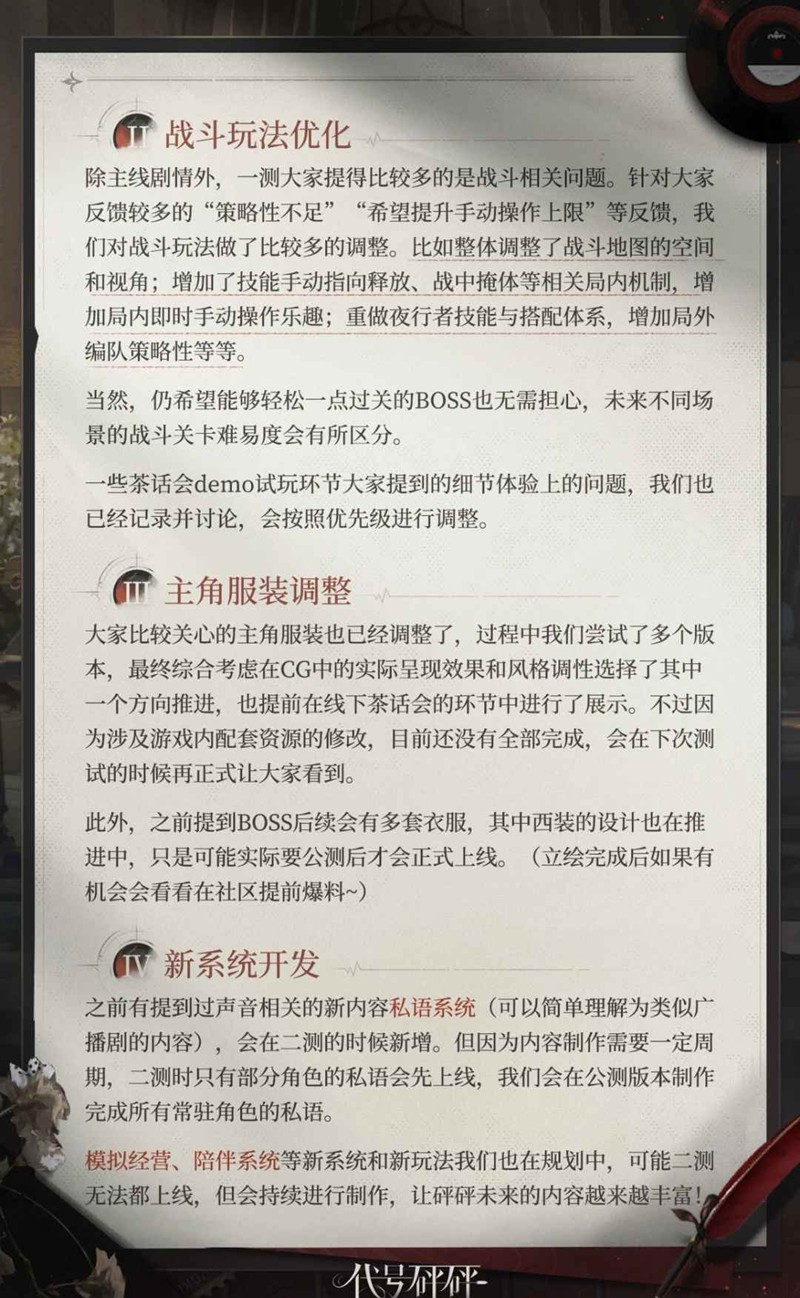 除主线剧情外,一测大家提得比较多的是战斗相关问题。针对大家反馈较多的“策略性不足”“希望提升手动操作上限”等反馈,我们对战斗玩法做了比较多的调整。比如整体调整了战斗地图的空间和视角;增加了技能手动指向释放、战中掩体等相关局内机制,增加局内即时手动操作乐趣;重做夜行者技能与搭配体系,增加局外编队策略性等等。