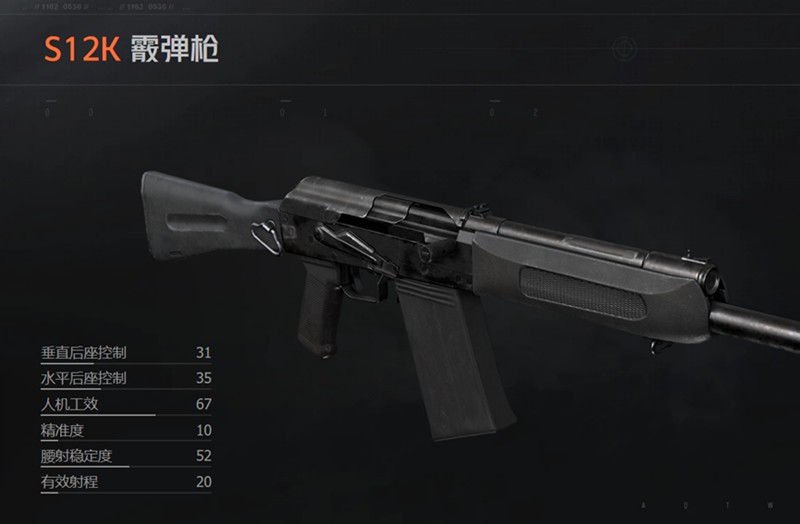 S12K击发模式为半自动,采用转拴式枪栓与长行程气动式活塞结构,初始供弹容量为5发,口径为12x70毫米,枪口初速达到396米/秒,理论射速约为每分钟200发,全重4.85公斤。作为游戏中唯一支持连续射击的霰弹枪,S12K在近战爆发能力上远超其他同类武器,尤其适合在室内作战、破门突入或遭遇战中使用。其高射速配合多发命中特性,能在极短时间内倾泻大量火力,压制敌方反应。