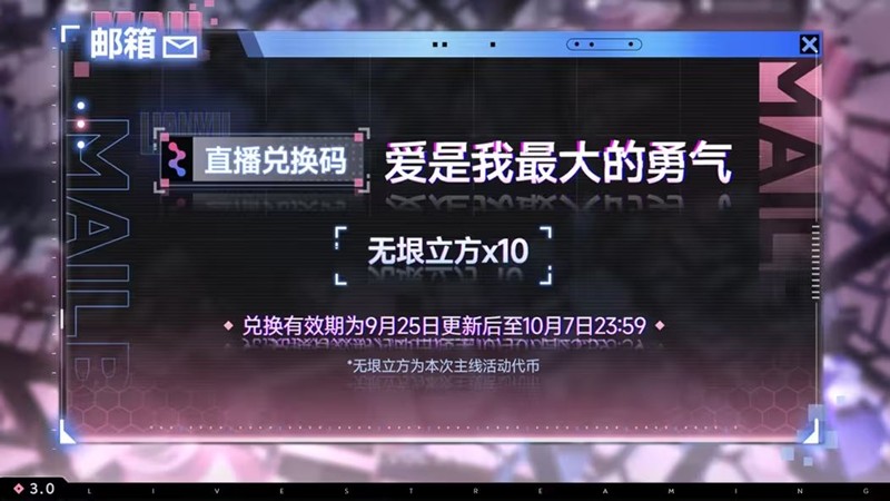 此外,《恋与制作人》还推出了直播兑换码活动,兑换码为“爱是我最大的勇气”,玩家可以通过该兑换码获得10个“无垠立方”。兑换有效期为9月25日更新后至10月7日23:59。无垠立方是本次主线活动代币,玩家可以用来兑换各种丰厚奖励。