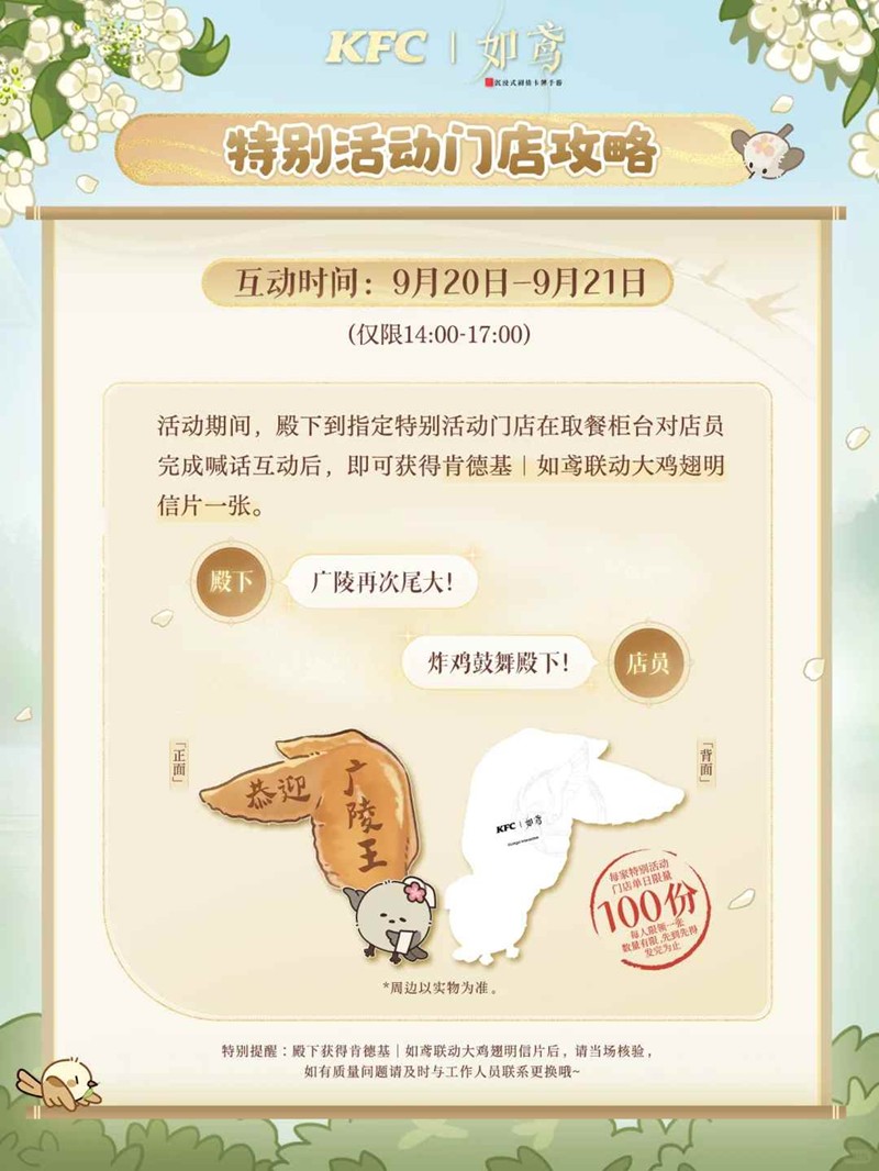 9月20日至9月21日指定时段,到指定特别活动门店取餐柜台处,寻店员对上暗语"广陵再次尾大!",得店员回应"炸鸡鼓舞殿下!",即有机会获赠肯德基|如鸢联动大鸡翅明信片一张。