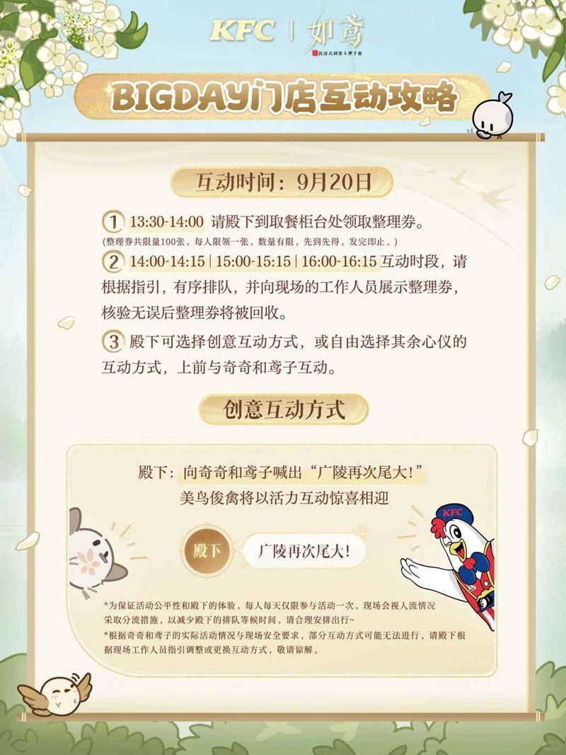 9月20日指定时段,奇奇与鸢子将现身肯德基新南方商城店外恭迎殿下,记得与它们一起打卡互动,共觅花间闲趣。