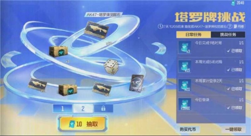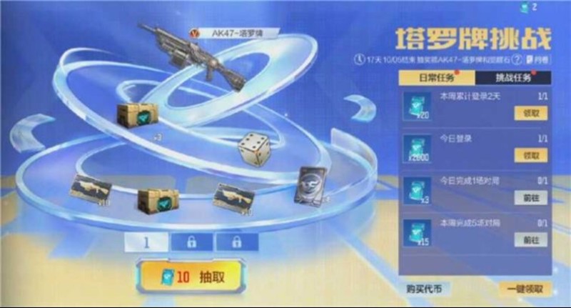 抽取完所有奖励共需要210枚抽奖币,这里帮大家简单统计一下任务最多能获得多少枚抽奖币,如果每天坚持完成任务的话,活动一共持续17天每天可以获取5枚抽奖币共计85枚,3周周任务可以获得共计135枚抽奖币,挑战任务共可获得80枚抽奖币,抽完奖池的所有奖励道具绰绰有余啦。十分期待入手AK47-塔罗牌觉醒的玩家可以选择每日完成日任务和周任务,时间紧张的玩家只需要在周末做完每周任务和所有挑战任务,都能够获取足够的抽奖币!