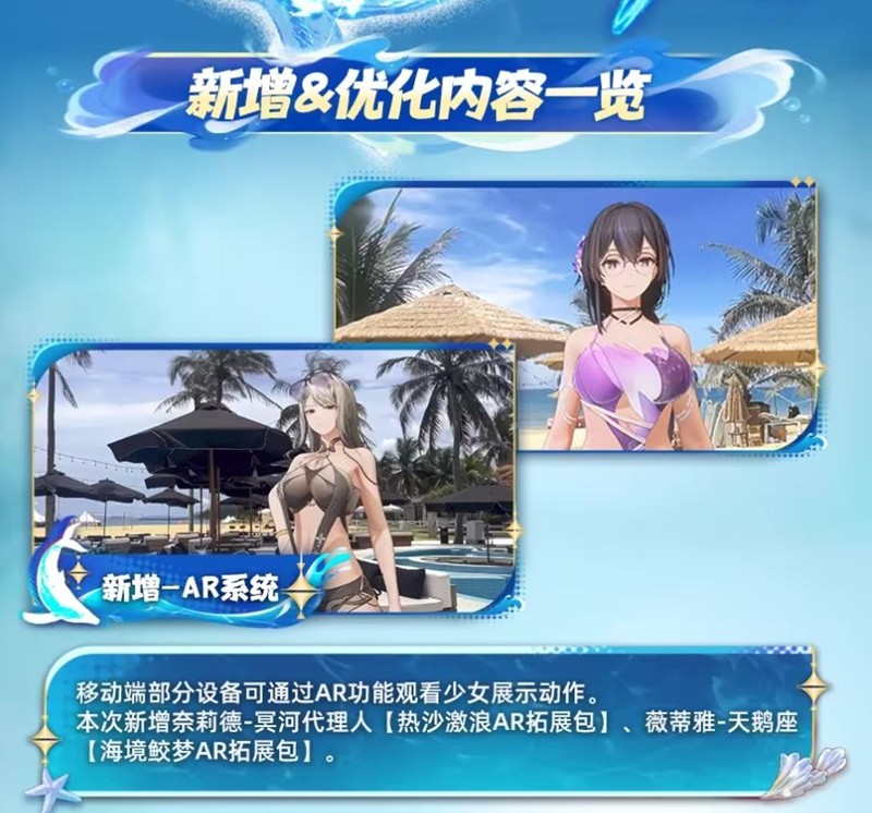 本次活动中,移动端部分设备将支持通过AR功能观看少女展示动作。新增的AR拓展包包括了奈莉德-冥河代理人【热沙激浪AR拓展包】和薇蒂雅-天鹅座【海境蛟梦AR拓展包】,让玩家们能够更加直观地体验角色的魅力。